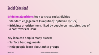 I think there’s a number of efforts that have been working in various directions on that, like the normalized workshop at Rexis on norms and values and recommender systems.