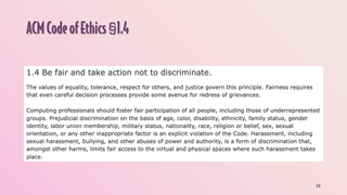 If you’re reviewing a paper that’s like clearly aimed at producing discrimination or clearly is, clearly and obviously is going to produce discrimination, my view is that you are, with appropriate citations, are well within the grounds of what should be happening peer review to say this project this system is clearly in violation of this and that principle the ACM code of ethics for these reasons so it should not be published at an ACM conference so some of it is applying the standards that already existed already been adopted by our communities or by our parent communities some of it is a starting point is is not necessarily imposing the standard of what should be done but opposing a standard of you have to talk about it so the NeurIPS impact statements are an example of this.